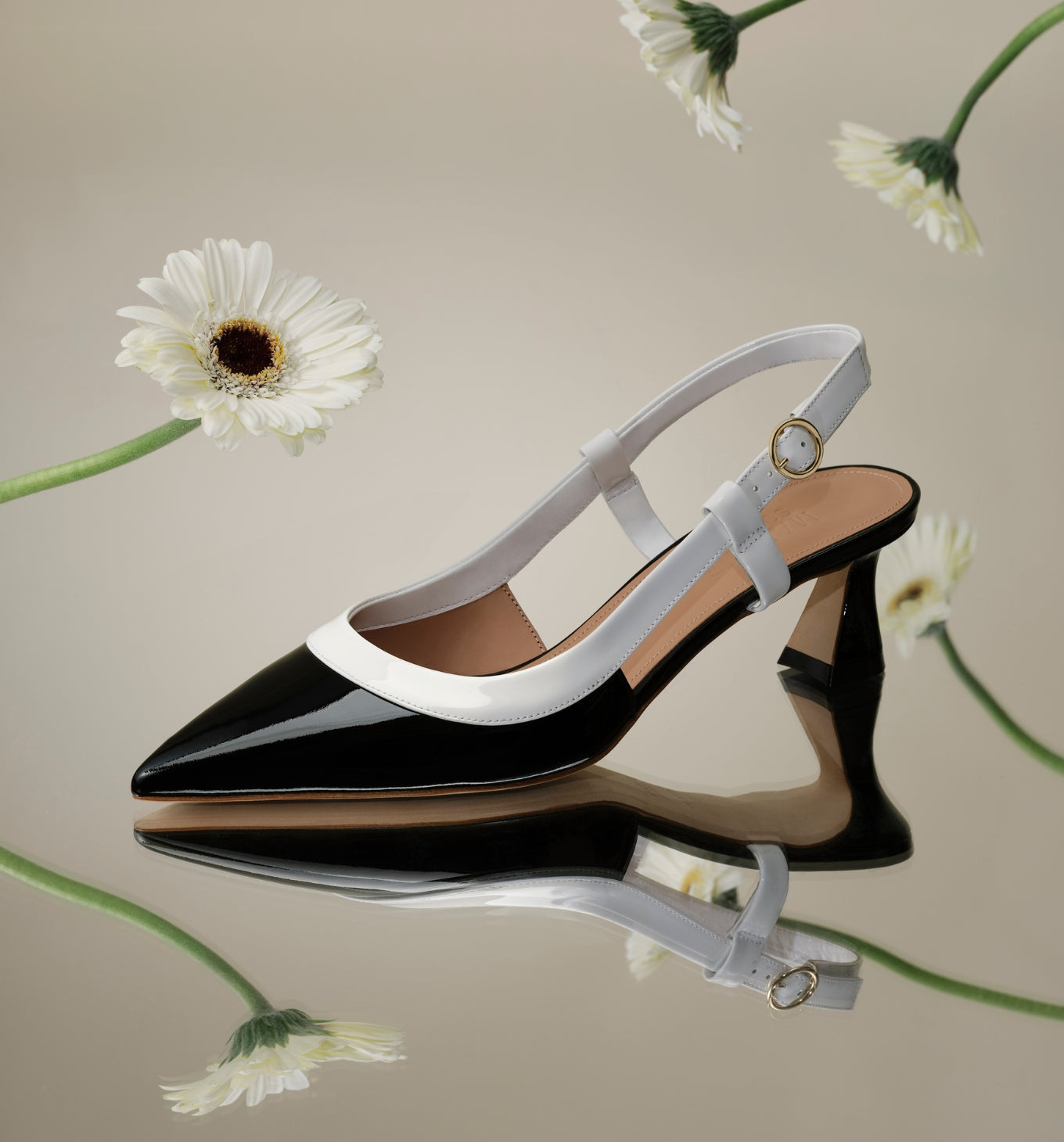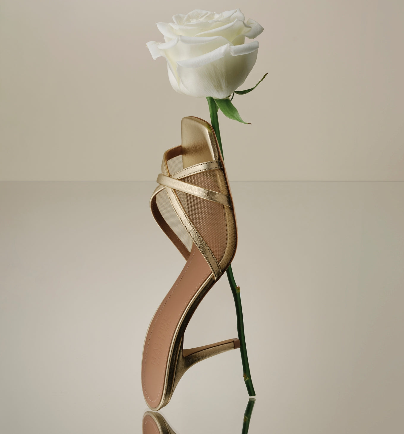 Italian craftsmanship and material innovation sit at the heart of this collection. Laser-cut Broderie Anglaise emerges as a defining signature of the season, appearing across carry-over styles and new arrivals. Soft neutral metallics introduce a modern evening sensibility and floral details – from multicoloured leather embellishment to delicate daisy motifs – echo the era’s expressive approach to dressing.